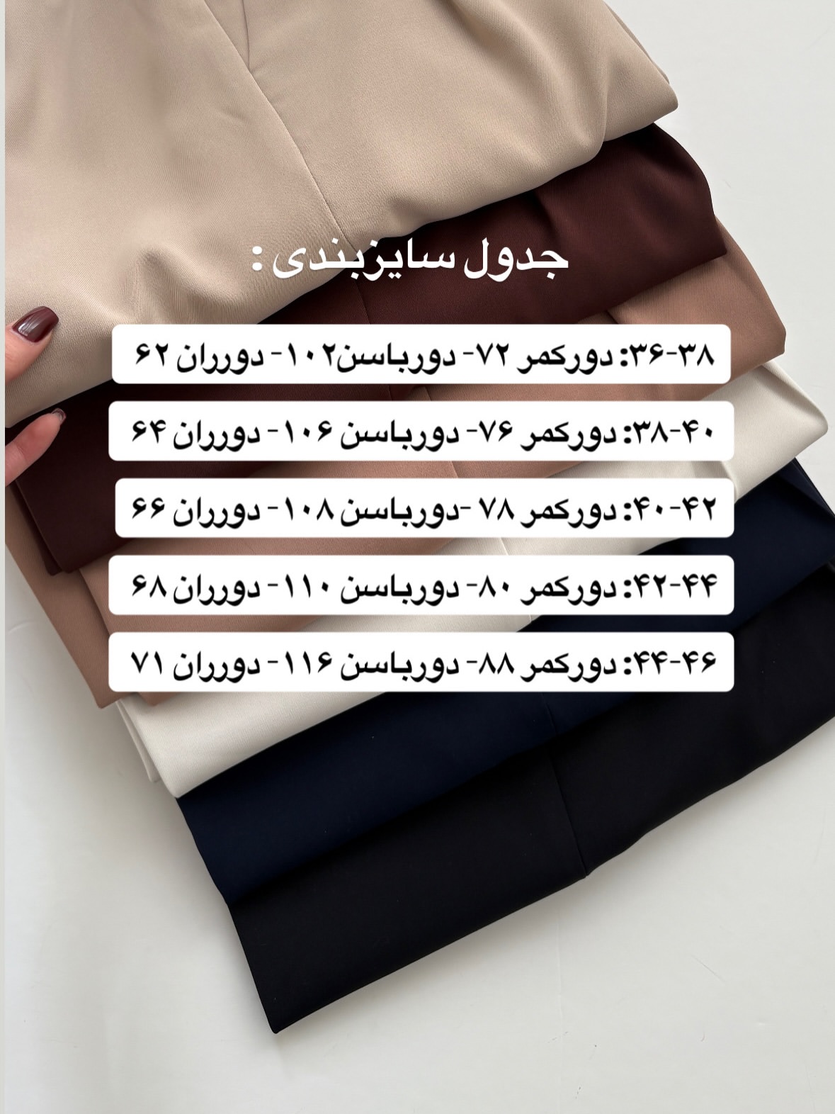 ۴۰-۴۲: دورکمر ۷۸ باسن ۱۰۸ ران ۶۶